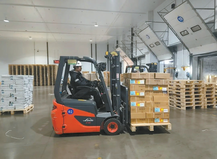 4月的京津物流园,到处是一片热火朝天的景象。8台冷藏集卡车整齐停放在2号冷库门前,叉车司机精准地铲起货物往返运送,理货员细致地清点货物数目,装卸工熟练地搬运并码放货物,各司其职、有条不紊。