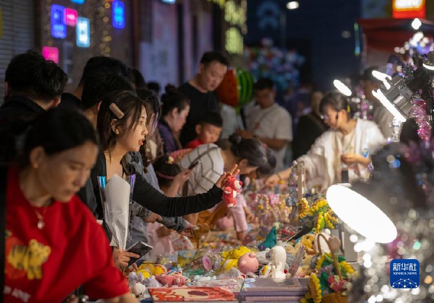 5月2日,游客在宁夏银川市金凤区阅彩城中街购买商品。新华社记者 杨植森 摄