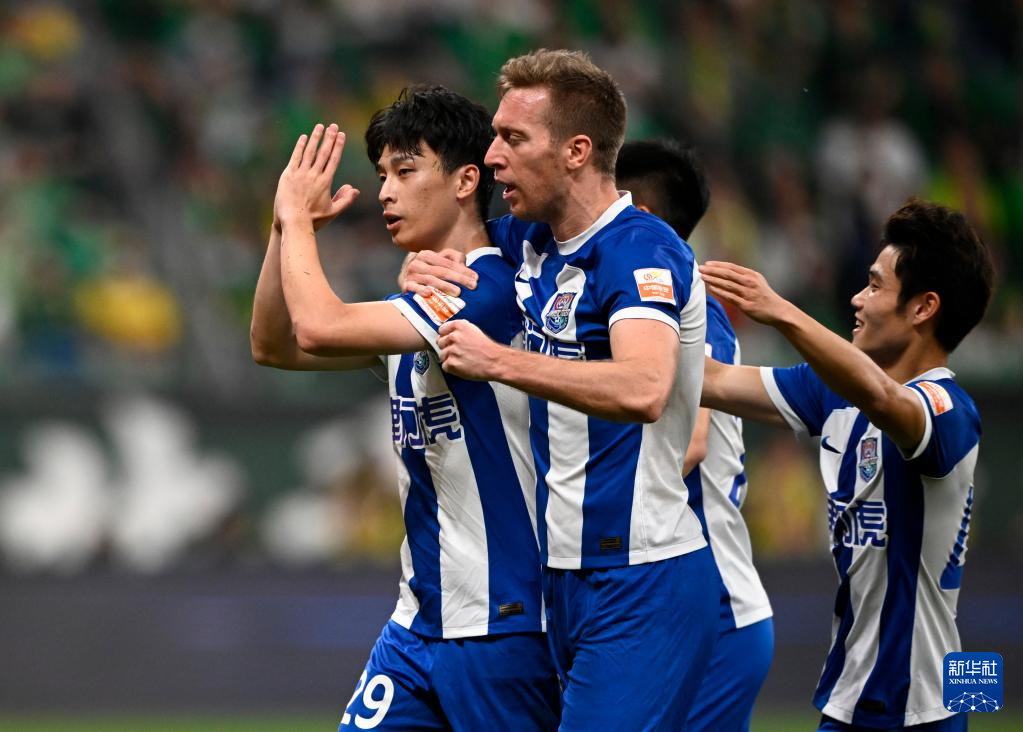 5月10日,北京国安队球员王子铭(左一)在比赛中庆祝进球。