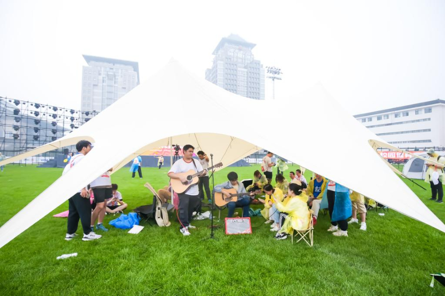 图为北大学生在搭设的露营帐篷中唱歌(北大供图)