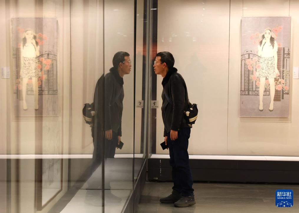 3月12日,参观者在观看“流光溢彩耀荆楚——湖北书画名家作品晋京展”。