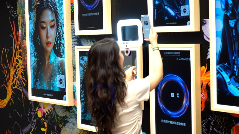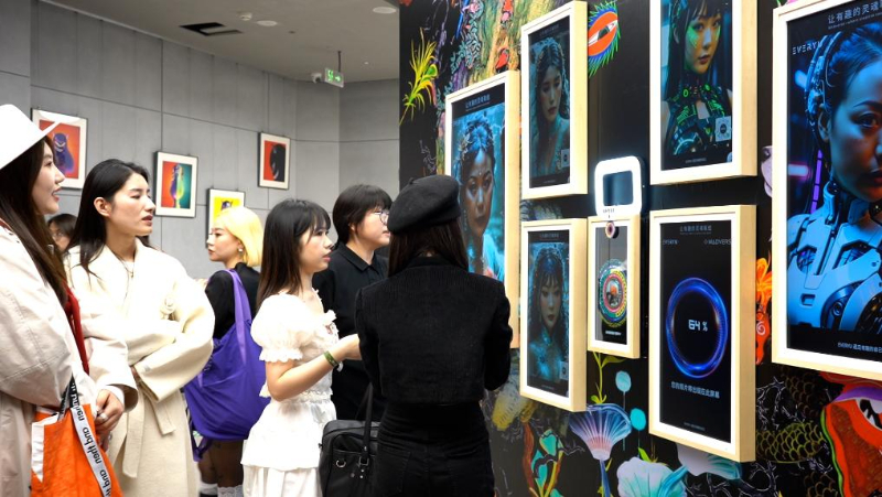 图为观众在数字艺术社交空间MADverse互动体验。(徐嘉何 摄)