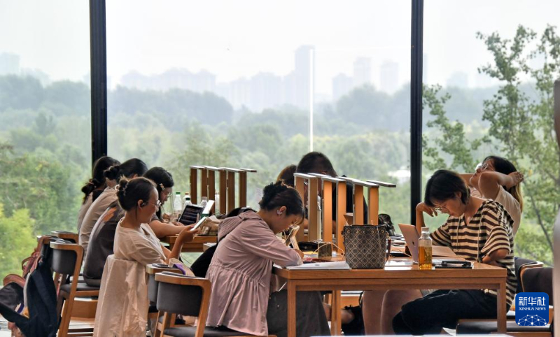 8月15日,市民在北京市通州区大运河沿岸的北京城市图书馆阅读。