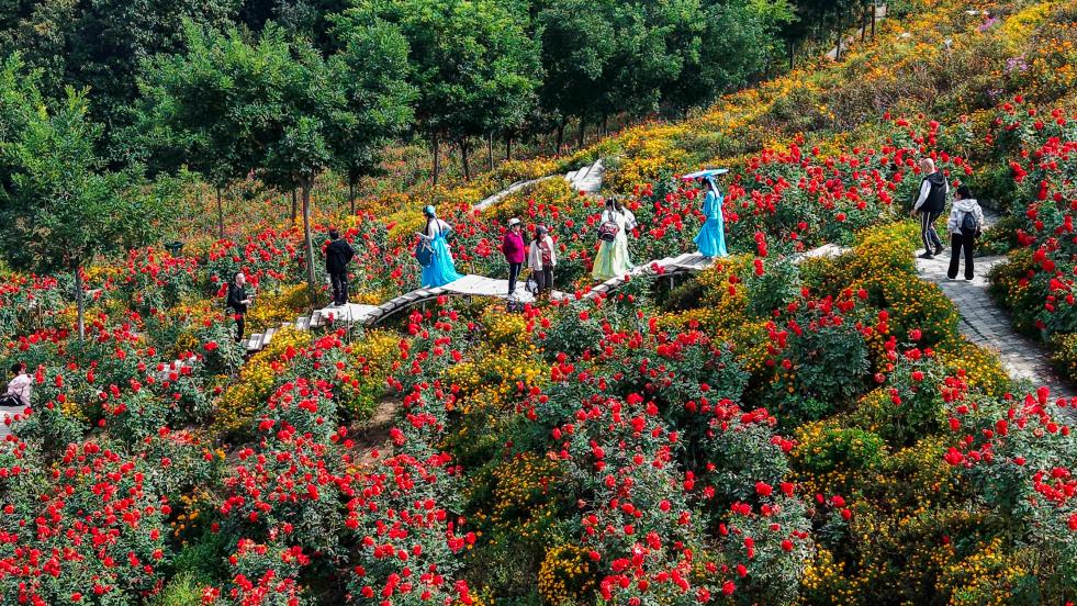 近日,游客在河北省承德市兴隆县一处花海游玩(无人机照片)。新华社发(刘满仓摄)