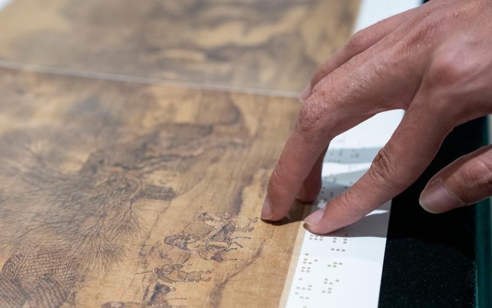 10月13日,视障人士在发布会后,欣赏无障碍版《触摸<清明上河图>》。