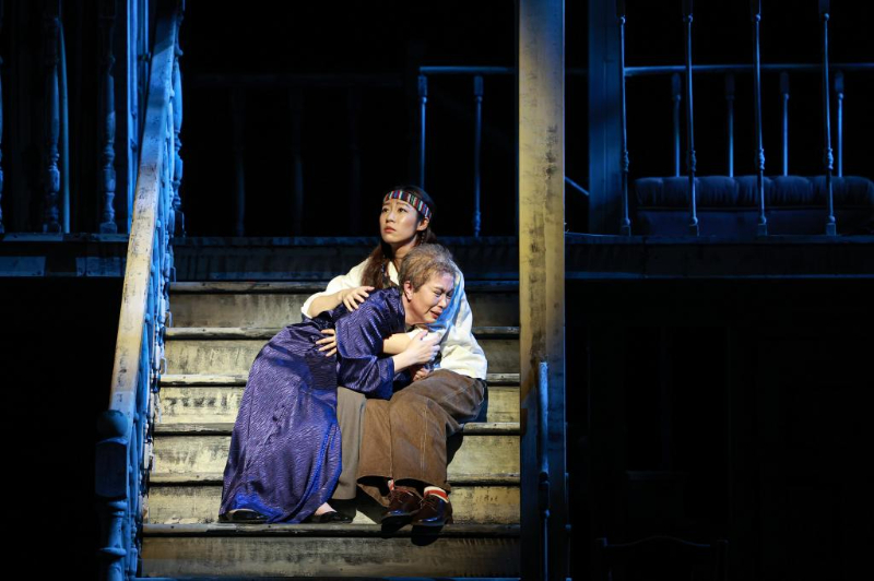 舞美设计申奥介绍,他采用线条、框架元素,将三层楼高的房屋搬上舞台,并以昏暗杂乱的布置营造一种压抑、沉闷的氛围。