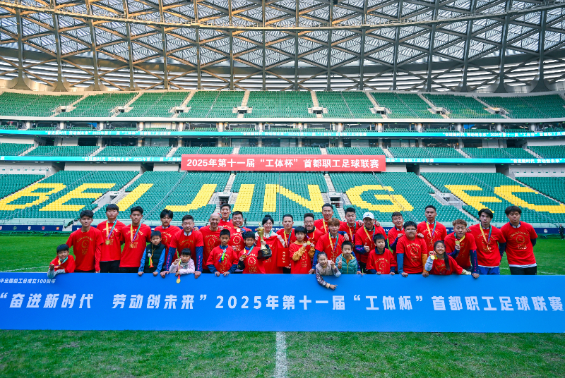 2025年第十一届“工体杯”首都职工足球联赛近日在北京工人体育场落下帷幕。经过两个多月的激烈角逐,冠军最终由朝阳区总工会代表队获得,西城区总工会代表队与北京市服务工会代表队分获亚军、季军。北京市服务工会代表队队员张兆辉获评“最佳射手”,朝阳区总工会代表队队员苗宇获评“最佳门将”。全国总工会宣教部、北京市总工会、北京市体育局有关负责人现场观看决赛并为获奖球队和队员颁奖。