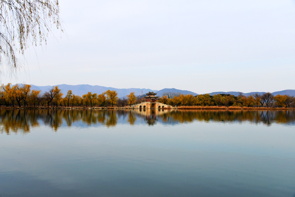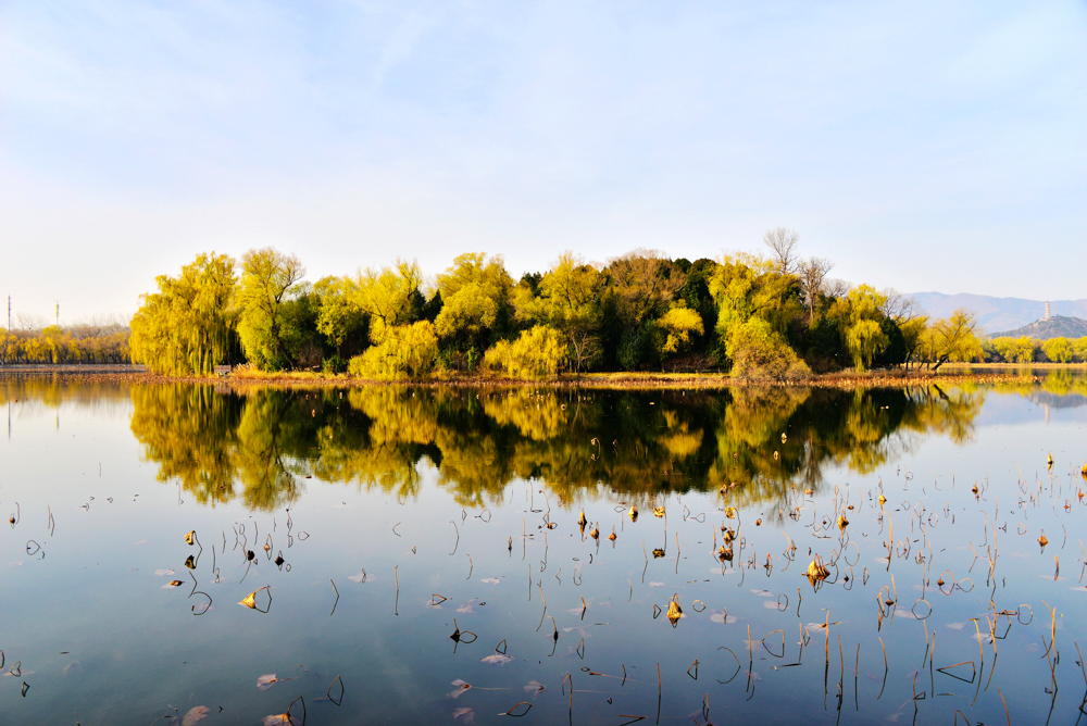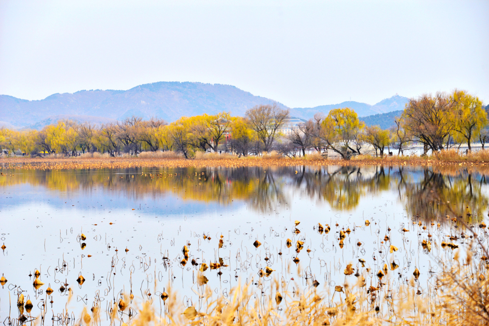 冬日清晨,北京颐和园笼罩在薄雾中,佛香阁与湖面相映成景,柳枝残荷点缀其间,宛若一幅幅水墨画卷。