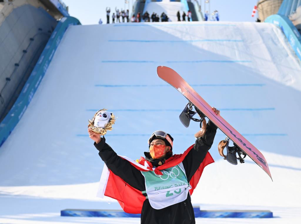 2022年2月15日,北京2022年冬奥会单板滑雪男子大跳台决赛在北京首钢滑雪大跳台举行。图为苏翊鸣在夺冠后庆祝。新华社记者 黄宗治 摄