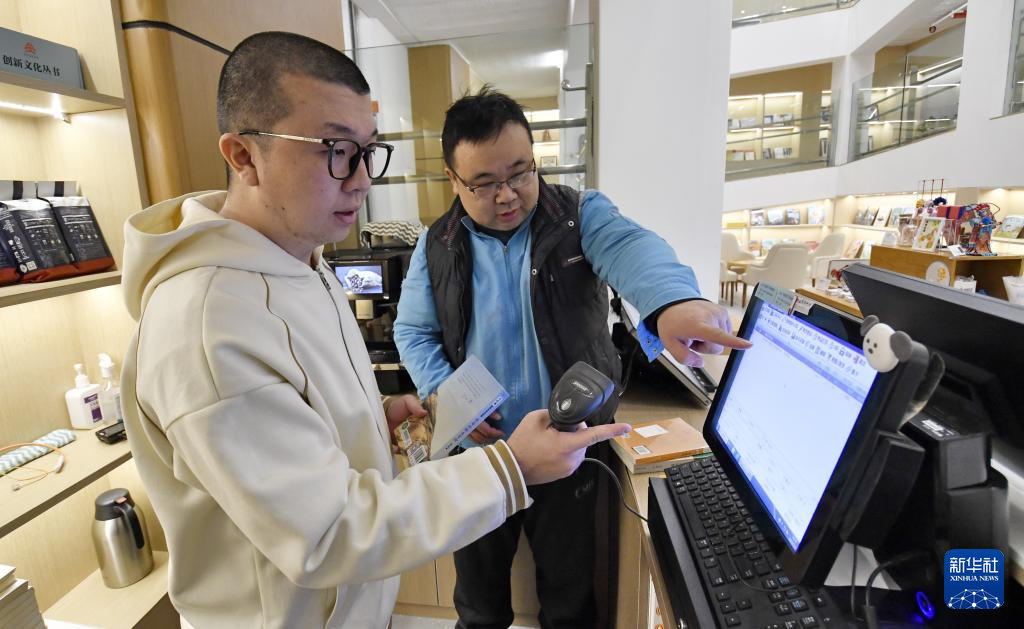 12月2日,汇爱大厦书店的工作人员(右)在指导心智障碍学员学习收款售货。