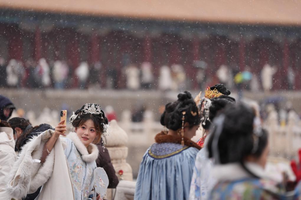 12月12日,游客在北京故宫赏雪拍照。