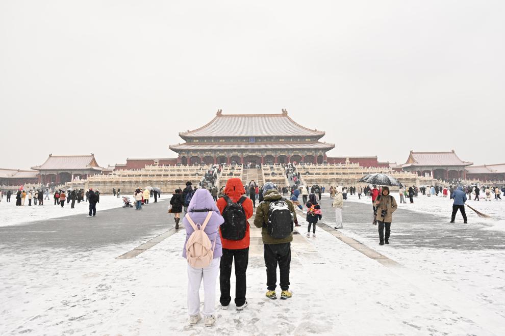 12月12日,游客冒雪参观北京故宫。
