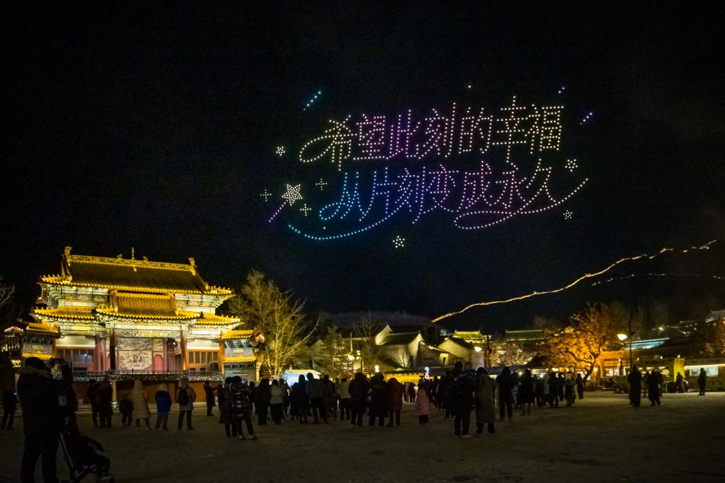 新华网北京12月26日电(夏子麟、戴琪果)12月的古北水镇游人如织,戏楼前、茶馆里、拱桥上处处洋溢着欢声笑语。舞狮少年在铿锵的鼓点中翻腾跳跃,非遗“风火流星”用炽热的铁笼划破夜空,无人机编队在夜幕中勾勒出绚烂的光影画卷,各式各样的精彩节目轮番上演,为游客带来沉浸式的多元体验。
