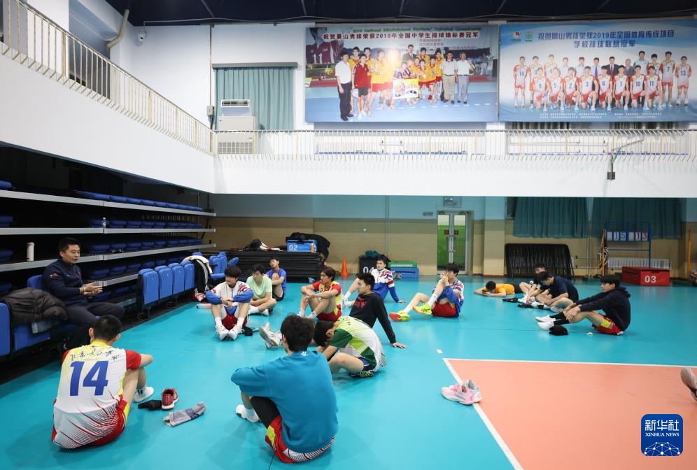 ↑北京景山学校排球队主教练李峰(右二)与球员们一起打训练赛