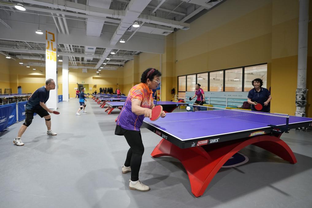 居民在北京回龙观体育文化公园的体育健身中心打乒乓球,该园经回天行动计划改造后直接惠及周边55家社区、6个村共40余万人。(新华社记者 鞠焕宗 摄)