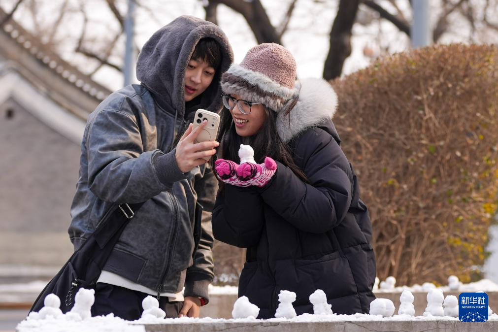 1月18日,人们在北京景山东街路边与“迷你”雪人合影。