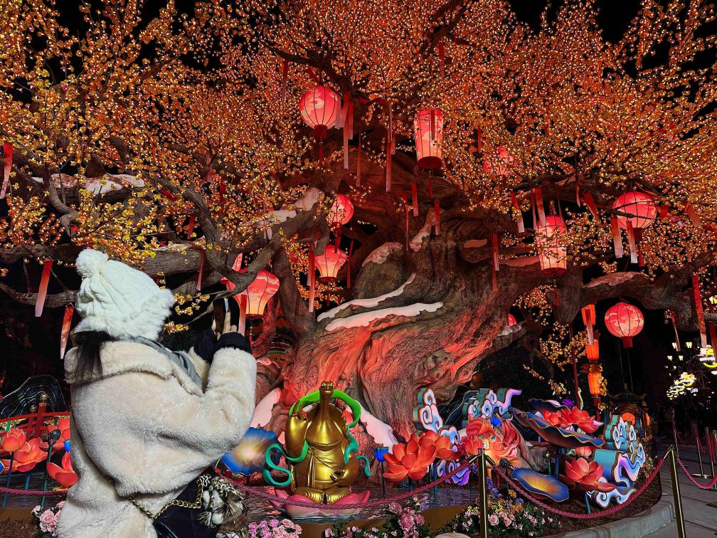 好莱坞大道尽头的“环球绮愿金梅树”下,不少游客驻足打卡。金色灯光随着专属音乐流转,全新设计的“音符凝香满园春”灯光庆典呈现出流光溢彩的视觉效果,勾勒出中国文化中冬日赏梅、祈福迎新的浪漫意境。