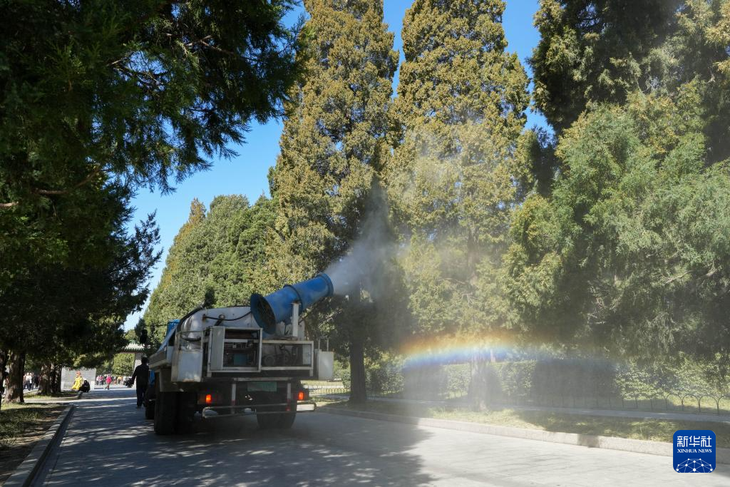 2025年3月20日,在北京天坛公园,工作人员驾驶雾炮车对飘散花粉的柏树进行喷淋。新华社记者 鞠焕宗 摄