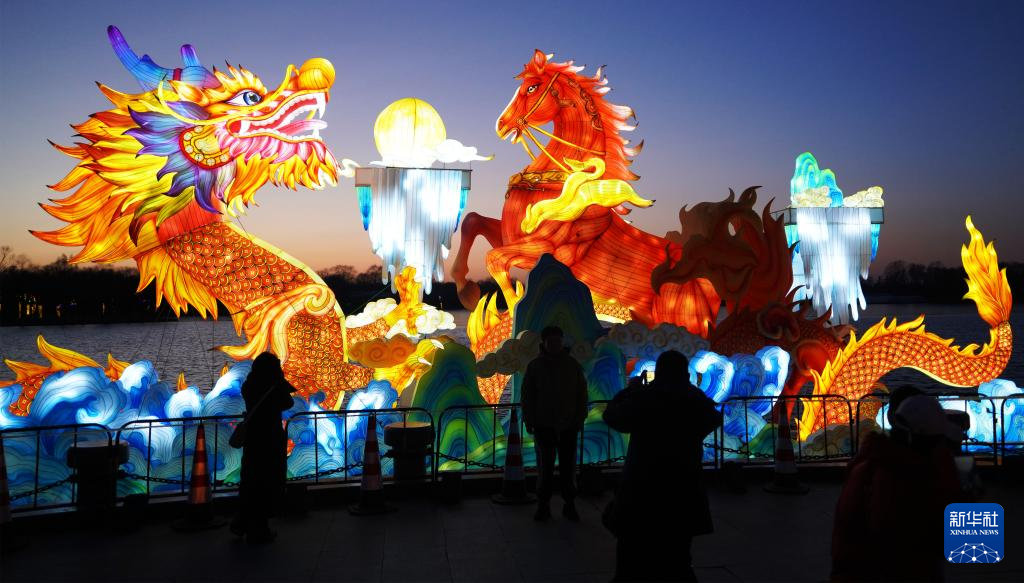 2月10日,观众在台湖公园观赏“龙腾马跃”大型彩灯。