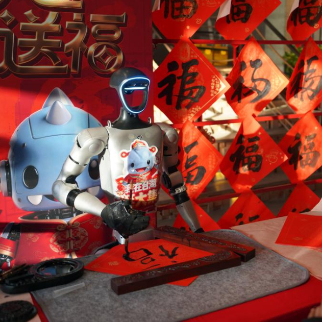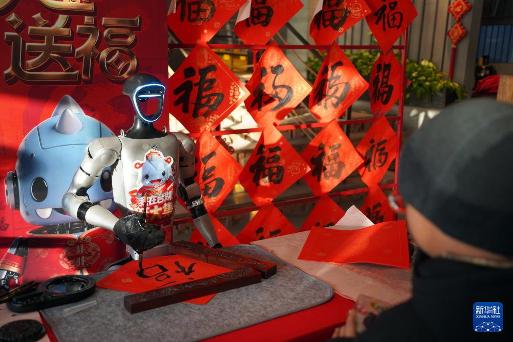 2月10日,游园的小朋友观看机器人书写福字。