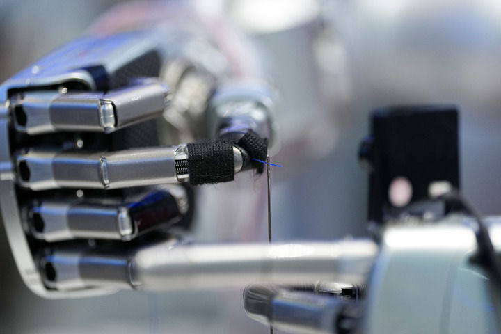 3月24日,在中关村展示中心常设展内,一台配备了灵巧手的机器人在展示穿针引线。新华社记者 鞠焕宗 摄