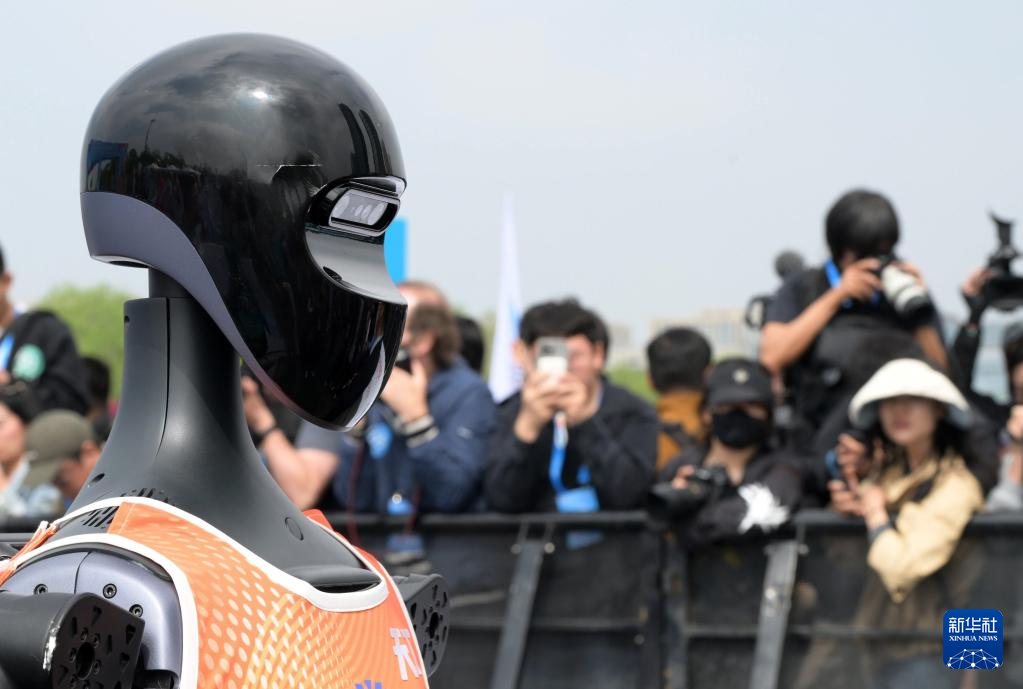 2025年4月19日,选手在北京亦庄半程马拉松暨人形机器人半程马拉松比赛中。新华社记者 曹灿 摄