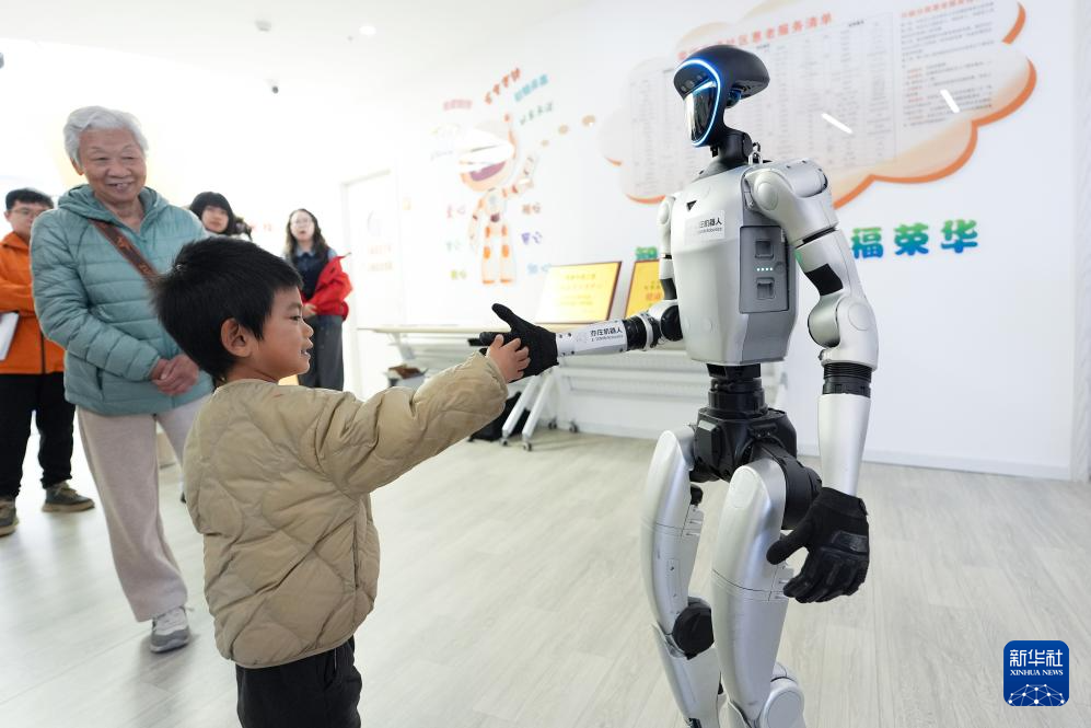 在智慧康养机器人养老驿站内,小朋友与一款人形机器人握手。