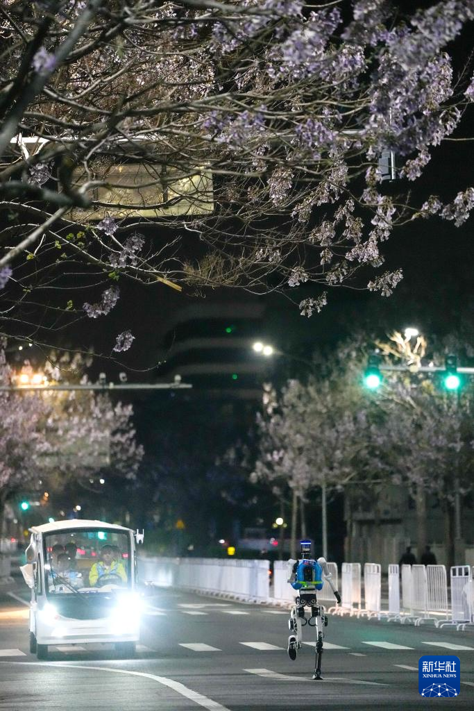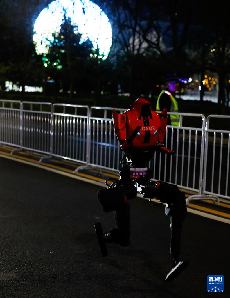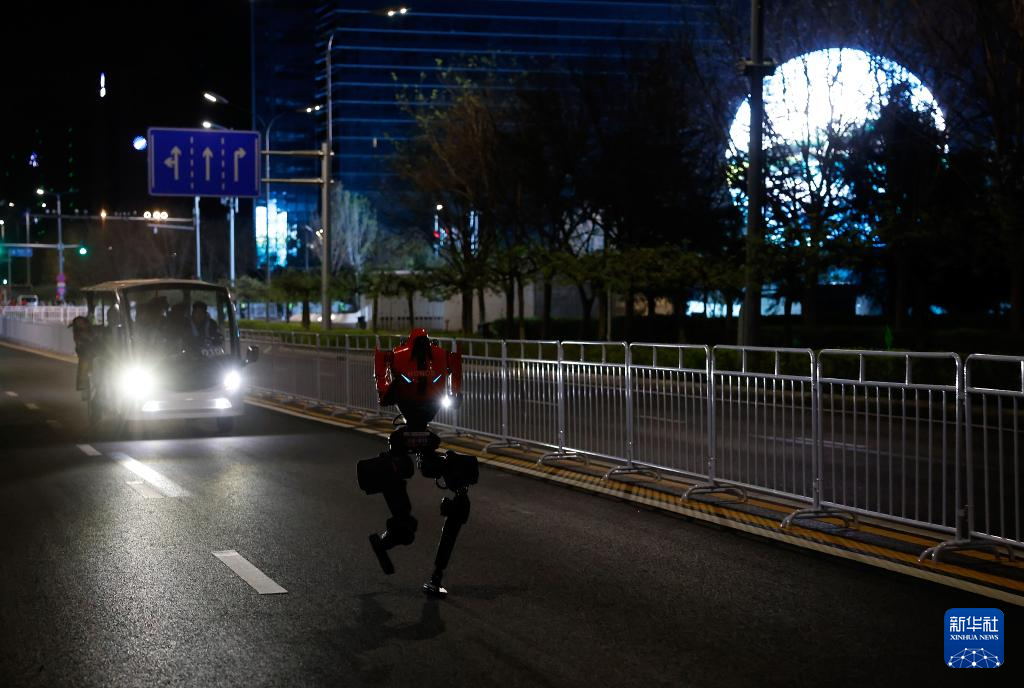 4月11日晚,一台机器人在测试活动中奔跑。 新华社记者 鞠焕宗 摄