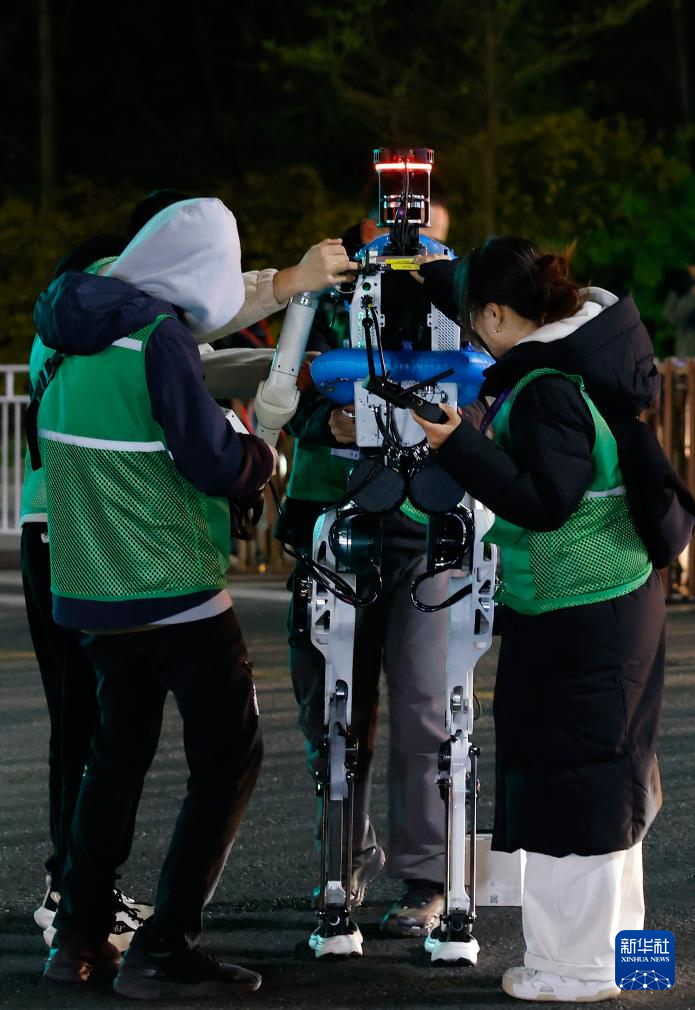 4月12日凌晨,操作人员在调试一台参加全要素测试的机器人。新华社发(翟一凡摄)