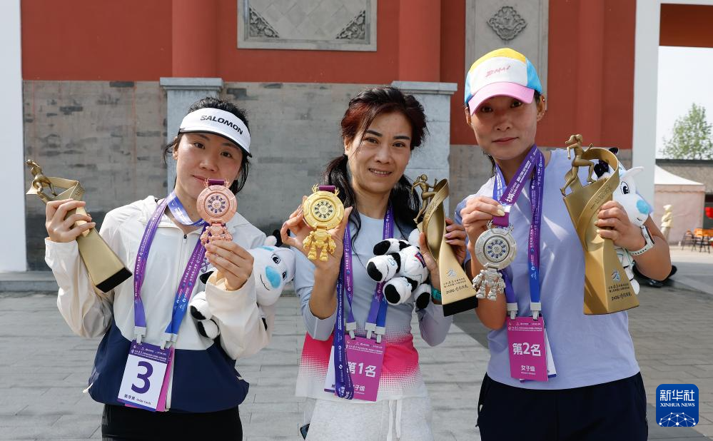 4月19日,女子组冠军王巧霞(中)、亚军杨小莉(右)和季军张晓敏在颁奖仪式后展示奖牌和奖杯。