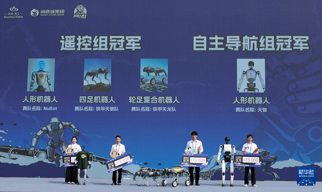 4月19日,人形机器人半程马拉松冠军齐天大圣队自主选手闪电(中)、亚军雷霆闪电队自主选手闪电(左二)和季军星火燎原队自主选手闪电(右一)在颁奖仪式上。