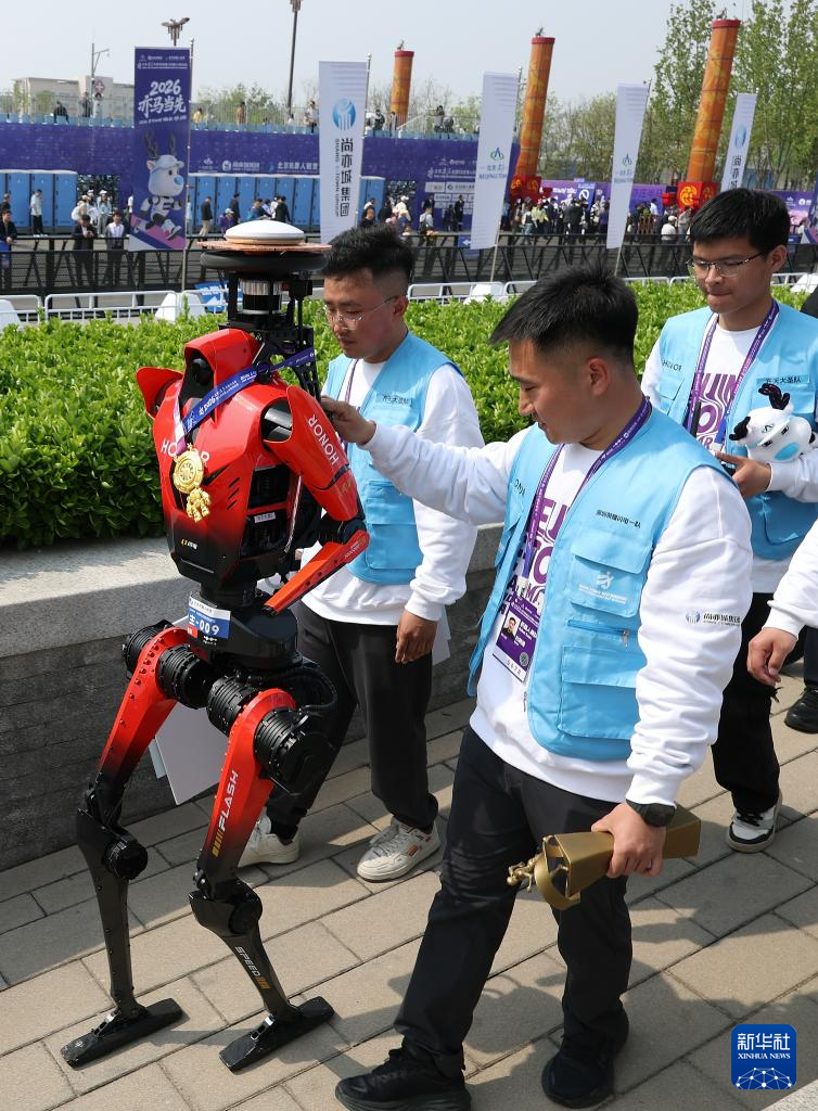 4月19日,人形机器人半程马拉松亚军雷霆闪电队自主选手闪电(前)在颁奖仪式后。