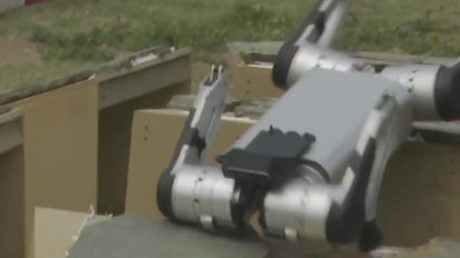 4月19日,齐天大圣队自主人形机器人选手闪电在比赛中。