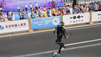 4月19日,天骁队自主人形机器人选手天工1.0Ultra在比赛中。