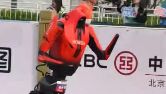 4月19日,上Y赛队自主人形机器人选手宇树H1(前)在比赛中。