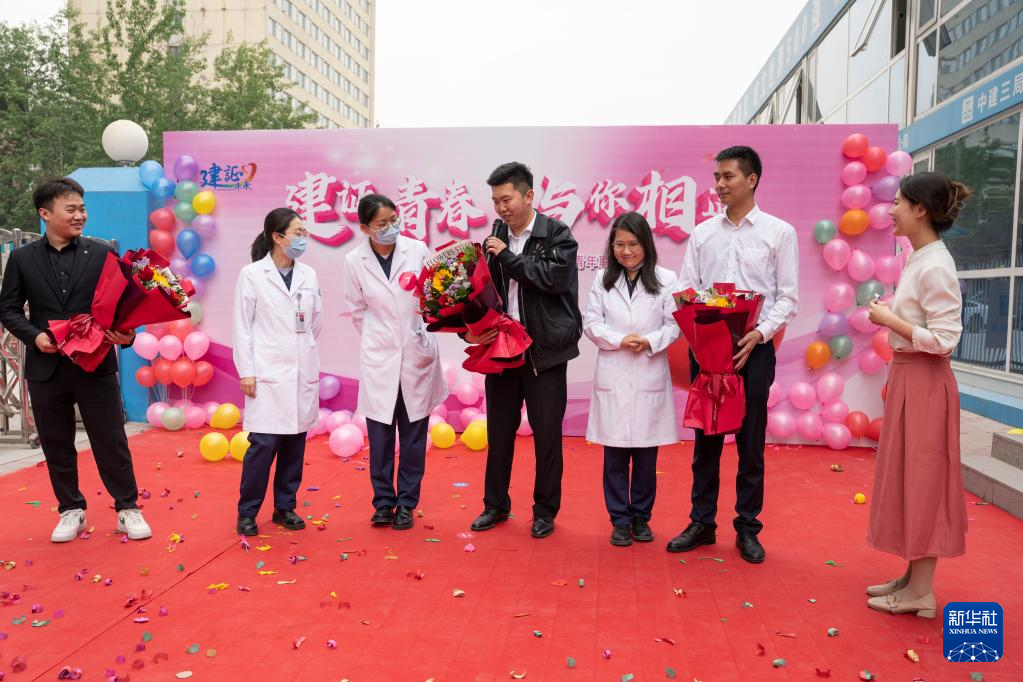 4月27日,在位于北京的空军特色医学中心项目部工地,青年职工参加“建证青春 与你相遇”联谊活动。