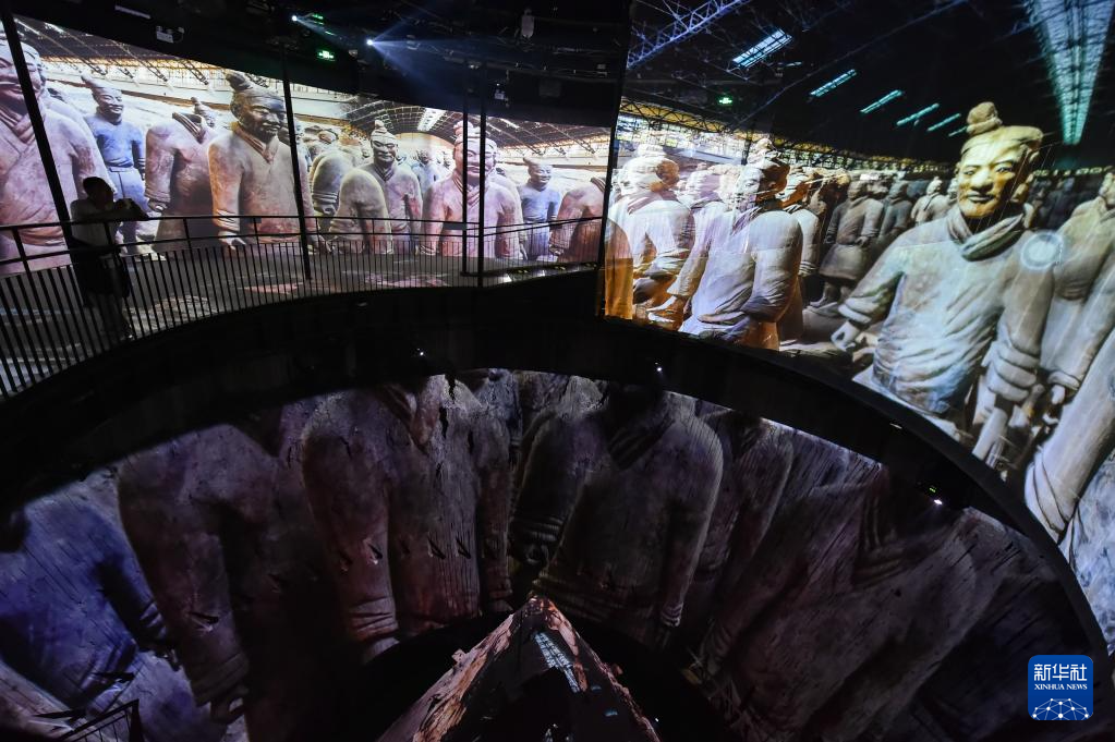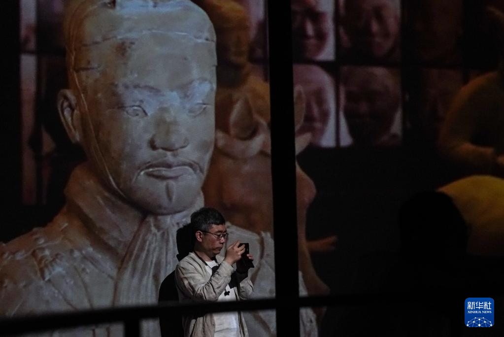 在位于北京的RE睿·国际创忆馆,观众在沉浸式展厅观看兵马俑影像(5月14日摄)。新华社记者 陈钟昊 摄