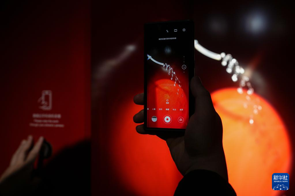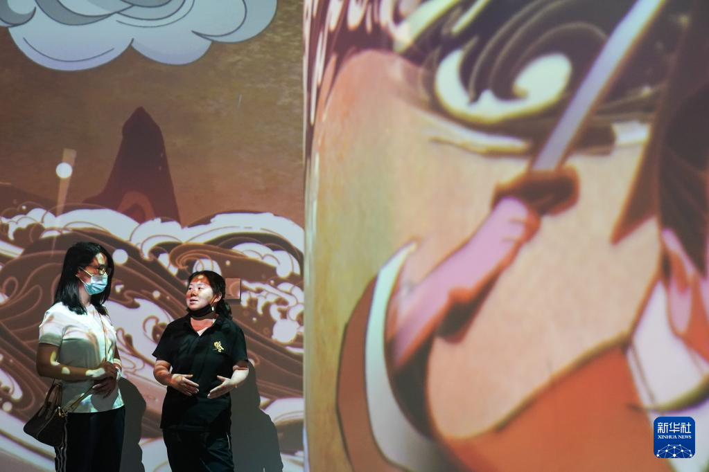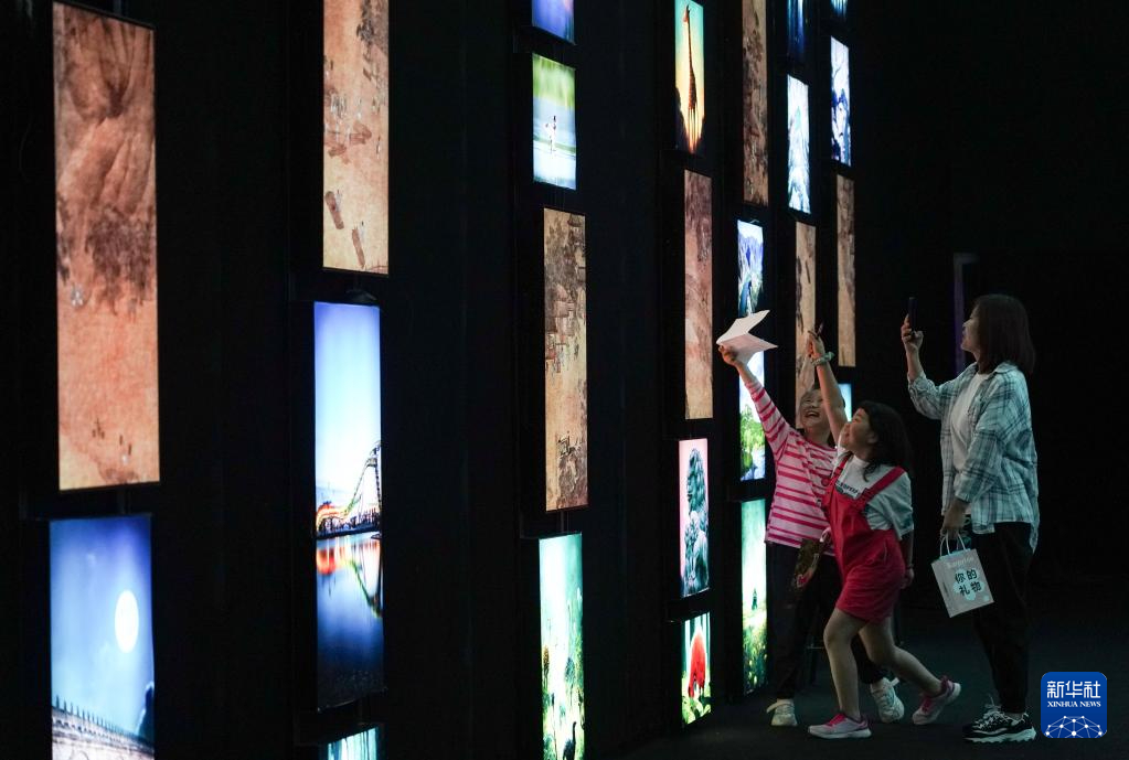 在位于北京的瞭仓数字藏品博物馆,观众在一间展示永定河传说的展厅里拍照(5月9日摄)。新华社记者 陈钟昊 摄