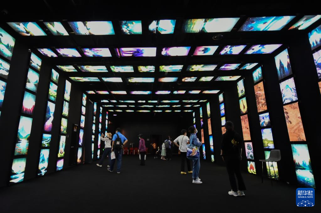 在位于北京的瞭仓数字藏品博物馆,观众在一间以永定河生态为主题、展示动态画作、实景照片和人工智能生成画作的展厅里参观(5月14日摄)。新华社记者 陈钟昊 摄
