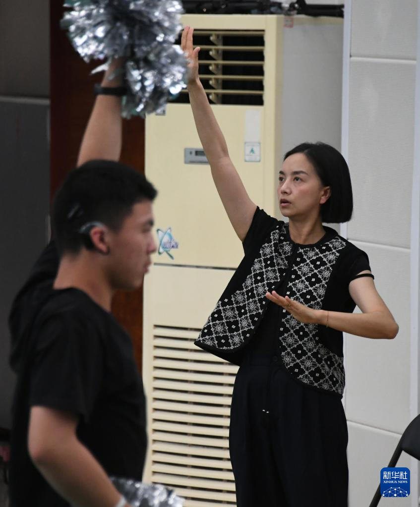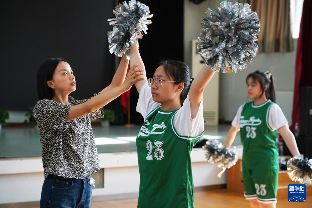 在北京市健翔学校,廖茜(右)指挥舞蹈团的学生训练(5月11日摄)。