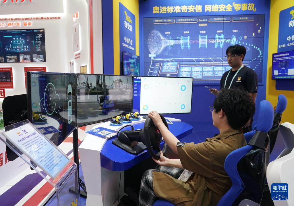 5月26日,在中关村国家自主创新示范区展示中心,工作人员(后)进行汽车仿真平台漏洞攻防演示。