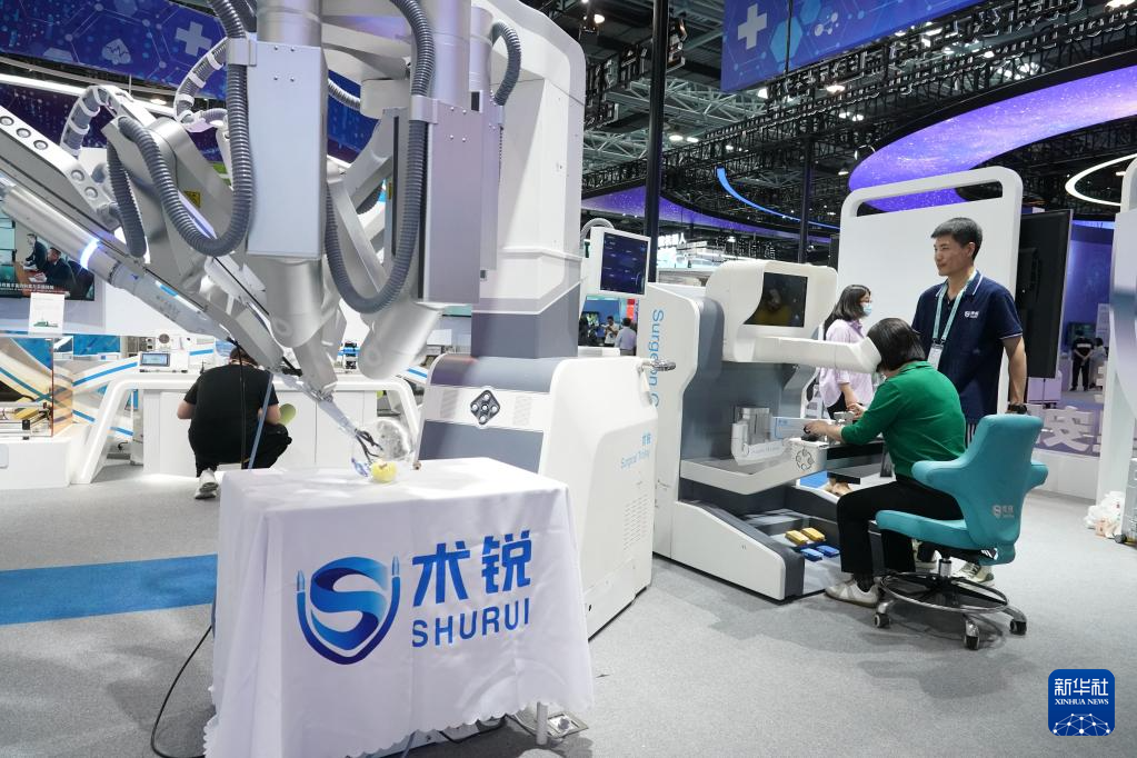 5月26日在中关村国家自主创新示范区展示中心拍摄的单孔腔镜手术机器人。