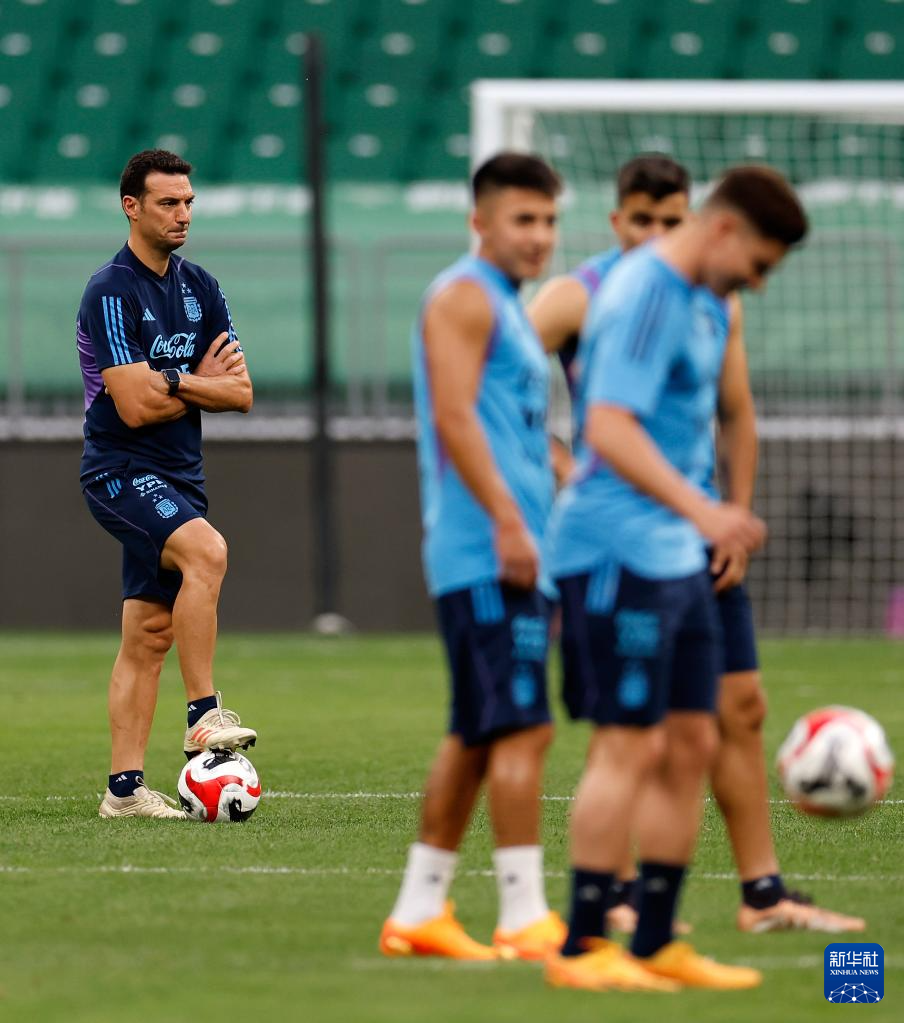 6月14日,阿根廷队主教练斯卡洛尼(右二)在训练中。