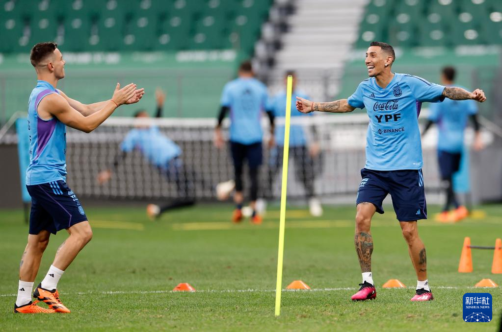 6月14日,阿根廷队球员迪玛利亚(右)在训练中。