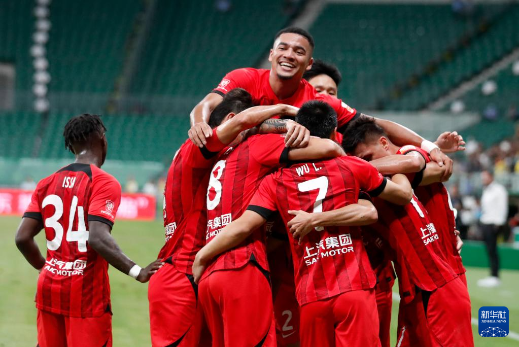 6月29日,上海海港队球员庆祝吕文君的进球。
