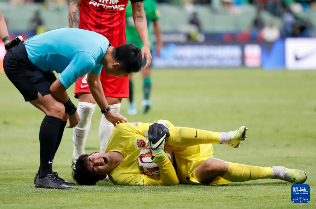 6月29日,上海海港队守门员颜骏凌(下)救险受伤后痛苦倒地,主裁判马宁上前查看。
