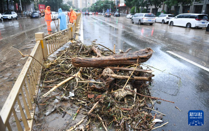 7月31日,环卫工人在北京市门头沟区新桥大街清理街道上的杂物。