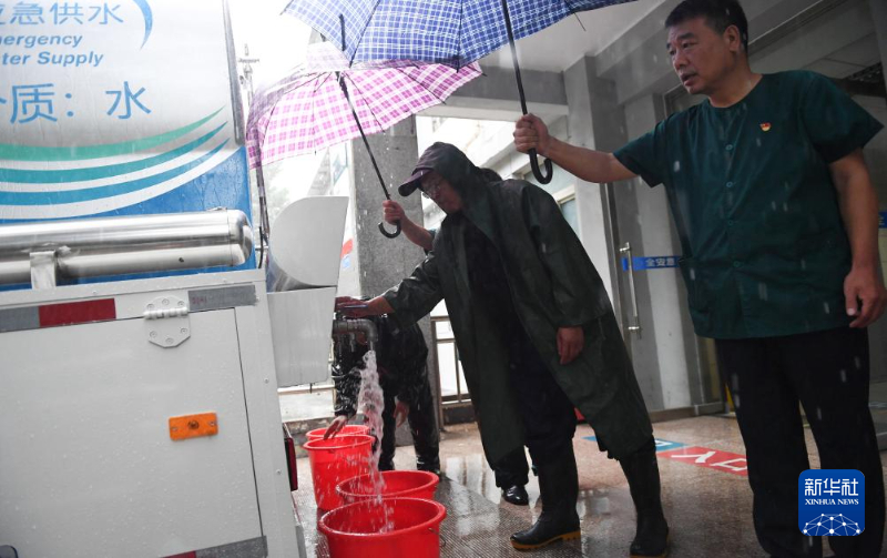 7月31日,在北京市门头沟区,一辆北京市自来水集团的水车为因强降雨停水的一处疗养院供水。