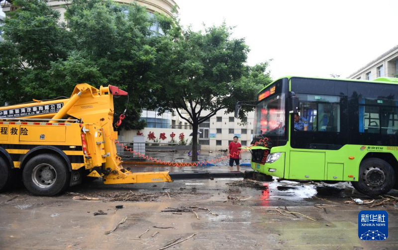 7月31日,抢险人员在北京市门头沟区新桥大街救援抛锚的公交车。