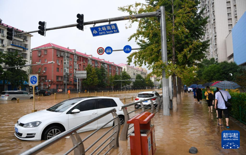 7月31日,在北京市门头沟区大峪南路,行人从积水的路面和泡水的车辆旁走过。